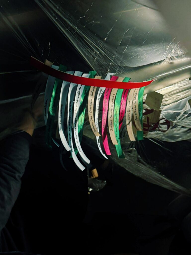 *Οι επισκέπτες καλούνται να καταθέσουν ένα κομμάτι της ζωής τους και να το αφήσουν να αιωρείται στο χώρο. Τέλος, να περάσουν κάτω από τις κορδέλες, αφήνοντας τον εαυτό τους να αγγιχτεί και να μεταβεί στην κοινή μας καθαρότητα.